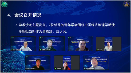 学术沙龙主题发言是由中国科学院地理科学与资源研究所杨宇研究员、北京大学城市与环境学院朱晟君教授、北京师范大学地理科学学部潘峰华教授、广东省科学院广州地理研究所叶玉瑶教授、东北师范大学地理科学学院刘艳军教授、河南大学地理与环境学院李二玲教授、中国科学院南京地理与湖泊研究所孙伟研究员等7位优秀青年学者围绕中国经济地理学新使命新担当新作为谈感想、谈认识。