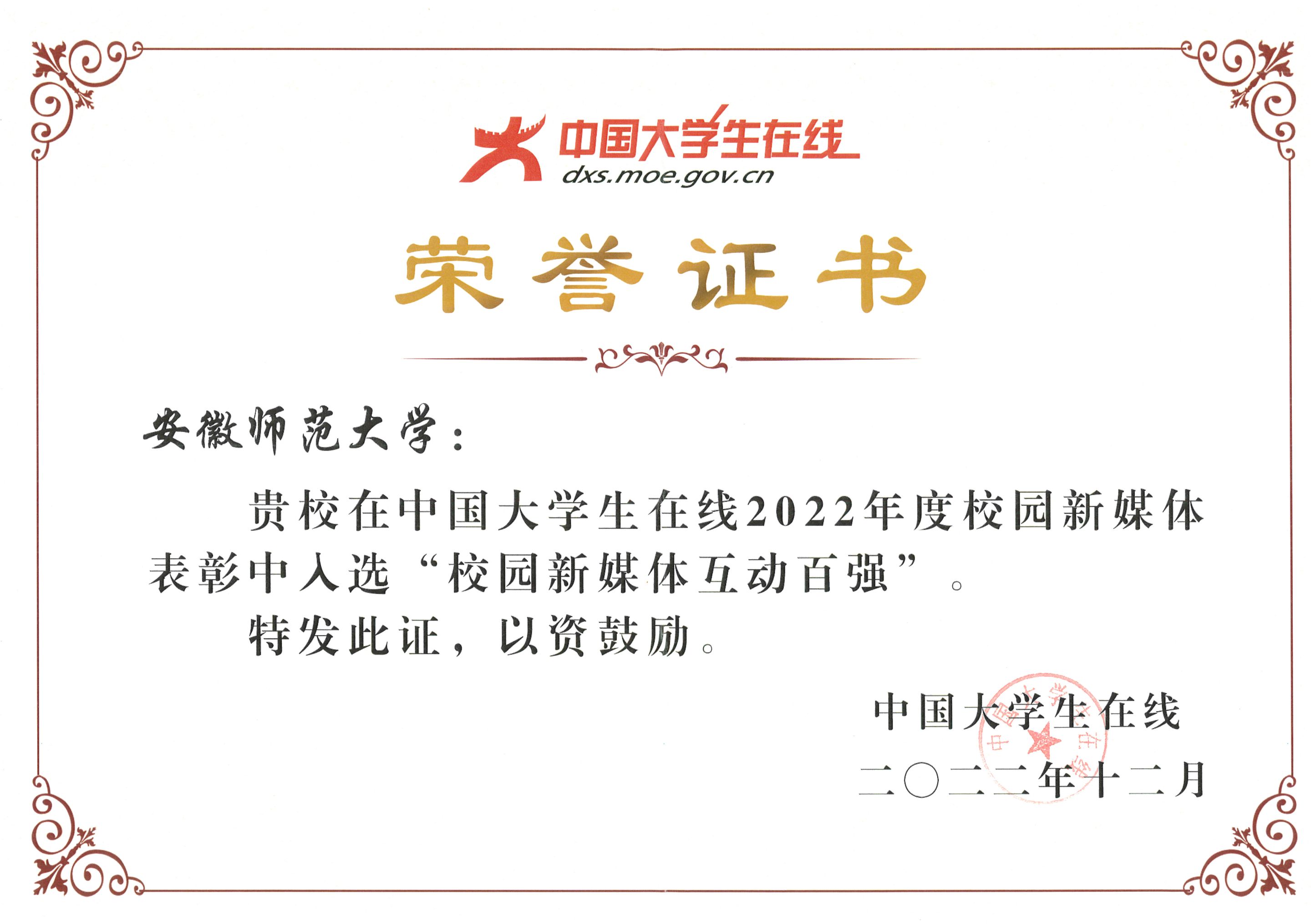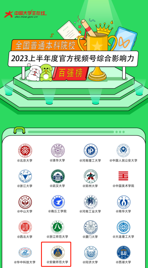 6月11日,教育部中国大学生在线公布了“2023上半年度全国高校官方视频号综合影响力百强榜”,安徽师范大学视频号跻身榜单前列,位列第18名。