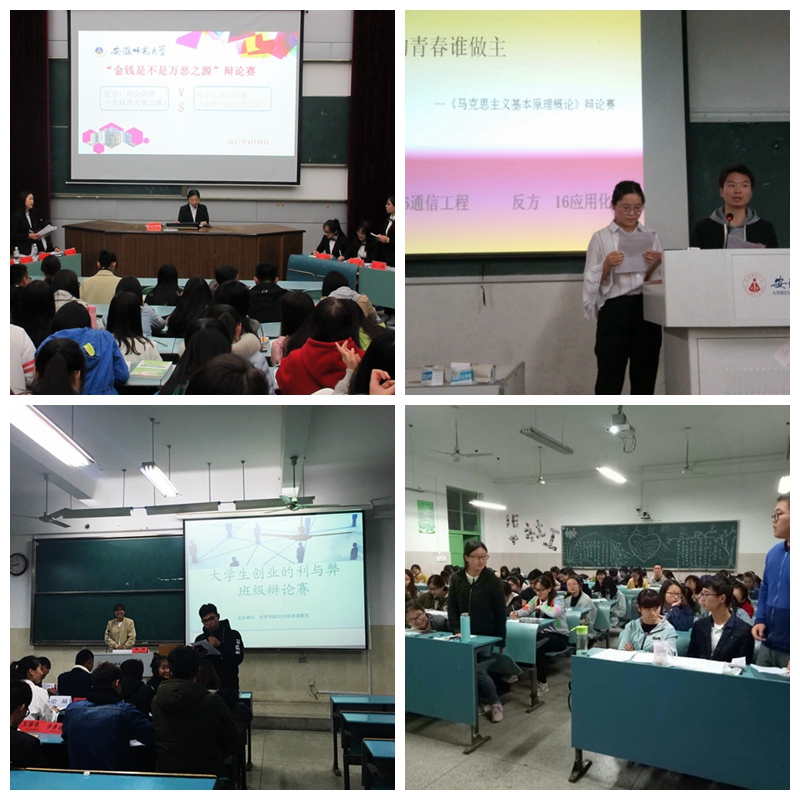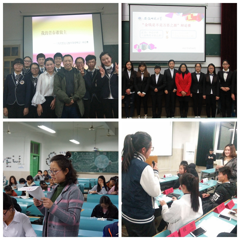 4月10日晚上汪盛玉老师指导16级会计学专业和16级会计ACCA班开展了主题为“金钱是否是万恶之源”的辩论赛活动。4月10日晚上和4月16日晚上,郭应传老师分别指导16级社会工作和16级社会学专业以“读书精好还是读书多好”为主题、16级公共管理专业以“政府对于网络舆论管理应严格还是放松”主题、酒店管理和土地资源管理专业以“对于大学生来说,专业知识和社会经验哪个更重要”为主题开展了别开生面的辩论赛。4月11号晚上刘宏老师指导16级体育教育专业就“大学生创业的利与弊”为题成功举行了辩论赛。4月13日晚上彭启福老师组织16级通信工程和应用化学两个班级学生成功举办了“我的青春谁做主”主题辩论赛。4月13日晚上李新老师指导16级旅游管理专业以“旅游发展的利与弊”、“出游方式是选择跟团游还是自助游”为主题举办了两场精彩辩论赛。4月16日晚上陈旭东老师指导16级法学2班以“网络舆论对司法公正的积极作用大于消极作用还是消极作用大于积极作用”为题开展了辩论赛活动。