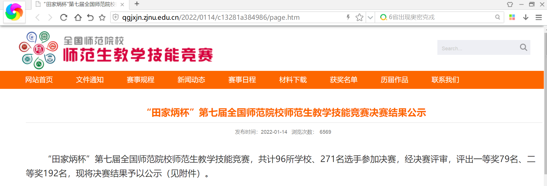 “田家炳杯”全国师范院校师范生教学技能竞赛由浙江师范大学主办,田家炳基金会冠名赞助,已举办了六届,是目前国内层次最高、影响最大的师范生教学技能大赛。本届比赛分初赛、决赛两个阶段。初赛阶段,全国147所院校890名选手提交了教学设计和视频作品,经评审,共选拔出271名选手进入决赛。决赛阶段,采用线上线下相结合方式进行,即“线上抽题、线下实施、视频实录、限时提交、在线评审”五个环节,要求选手在规定时间内,在竞赛网站抽取比赛题目,在限定的48小时内完成决赛作品(教学设计文本、说课视频、模拟上课视频),并上传提交到竞赛系统。决赛评审专家根据参赛材料和选手赛场表现打分,确定决赛成绩。