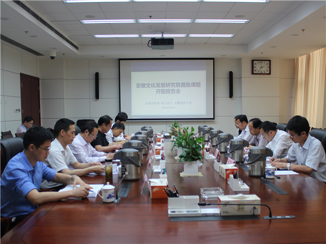 本网讯(科研处 王静)5月23日下午,我校在省行政中心1号楼东402会议室召开省级重点智库安徽文化发展研究院首批课题开题报告会。与会专家组成员有省委宣传部理论处处长唐国富、省委宣传部文艺处处长范伟军、省文化发展改革办公室调研员副主任康福升、省委宣传部理论处副处长陈德友、省文化厅办公室(政策法规处)副主任(副处长)李一兵,校党委副书记、安徽文化发展研究院主任李琳琦教授出席并主持会议,各课题组负责人、科研处有关人员参加会议。