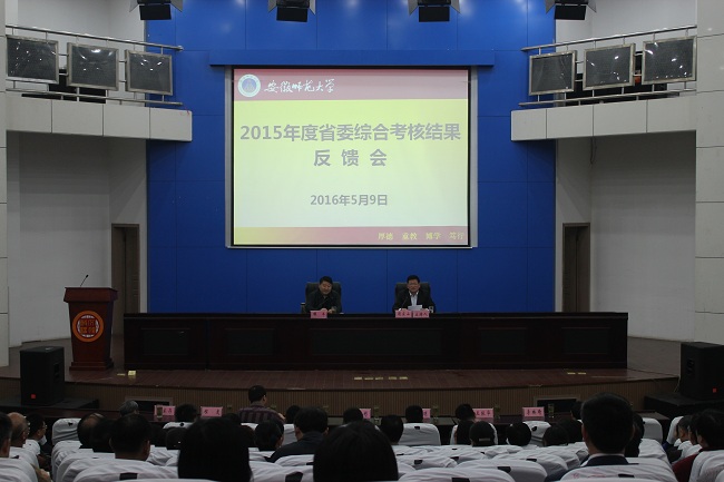 本网讯(党委宣传部 张鑫)5月9日,省委第十八考核组副组长、省委教育工委委员、省教育厅副厅长解平一行来我校,反馈学校领导班子和领导干部2015年度综合考核结果,并公布我校年度综合考核为“优秀”等次。省委第十八考核组成员,在校的全体校领导,机关部门处级以上干部、学院及直属单位党政正职,学校省级以上“两代表一委员”、民主党派市级以上主委、校教代会执委、正高职称人员和学生代表200余人参加了大会,会议由校党委书记顾家山主持。