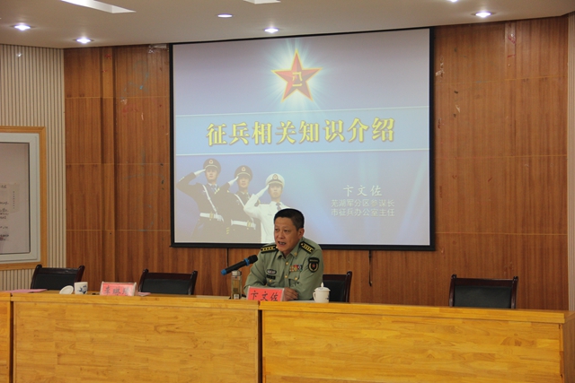 会后,我校国防教育导师、芜湖市军分区参谋长卞文佐大校作了大学生入伍专题报告,他从应征入伍流程、大学生入伍政策、芜湖市优待政策、大学生参军的人生意义等方面,为大家奉献了一场内容详实的精彩报告。芜湖市镜湖区人武部政委李强针对镜湖区的大学生应征入伍优待优抚政策做了解释说明,并和在场人员进行了现场问答咨询。