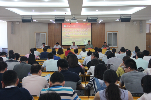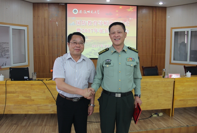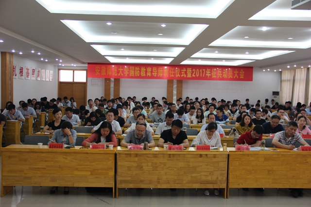 本网讯(人武部 孙良林)5月26日上午,学校在大学生活动中心三楼报告厅举行国防教育导师聘任仪式暨2017年征兵动员大会。校党委副书记李琳琦出席会议并讲话,芜湖市军分区参谋长卞文佐、镜湖区人武部负责同志、校人武部负责同志、各学院党委副书记、辅导员和学生代表参加会议。校人武部部长台启权主持会议。