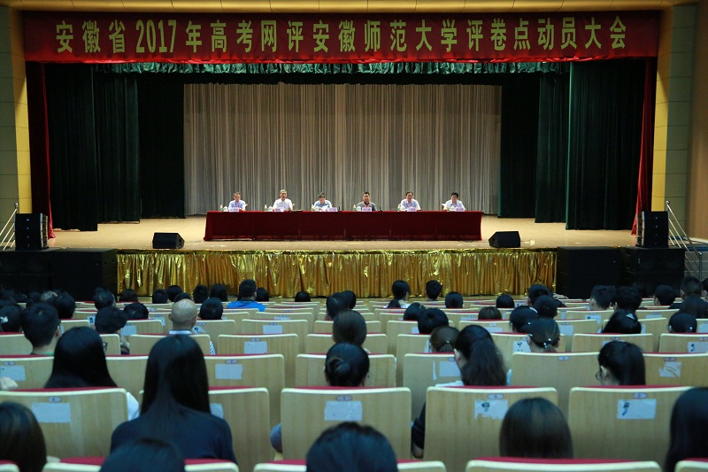 本网讯(党委宣传部 袁黎平 文 / 邾强 图)6月11日上午,安徽省2017年高考网上评卷安徽师范大学评卷点动员大会在我校召开。安徽省教育招生考试院副院长沈滔,安徽师范大学评卷点网评领导组副组长、校纪委书记程度出席会议并作动员讲话,安徽师范大学评卷点网评领导组副组长、副校长朱家存主持大会。网评办公室、评卷各工作组负责同志以及评卷教师和工作人员参加了大会。