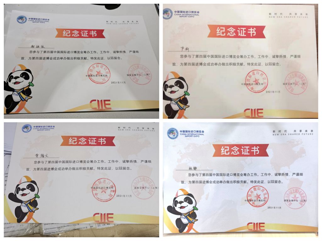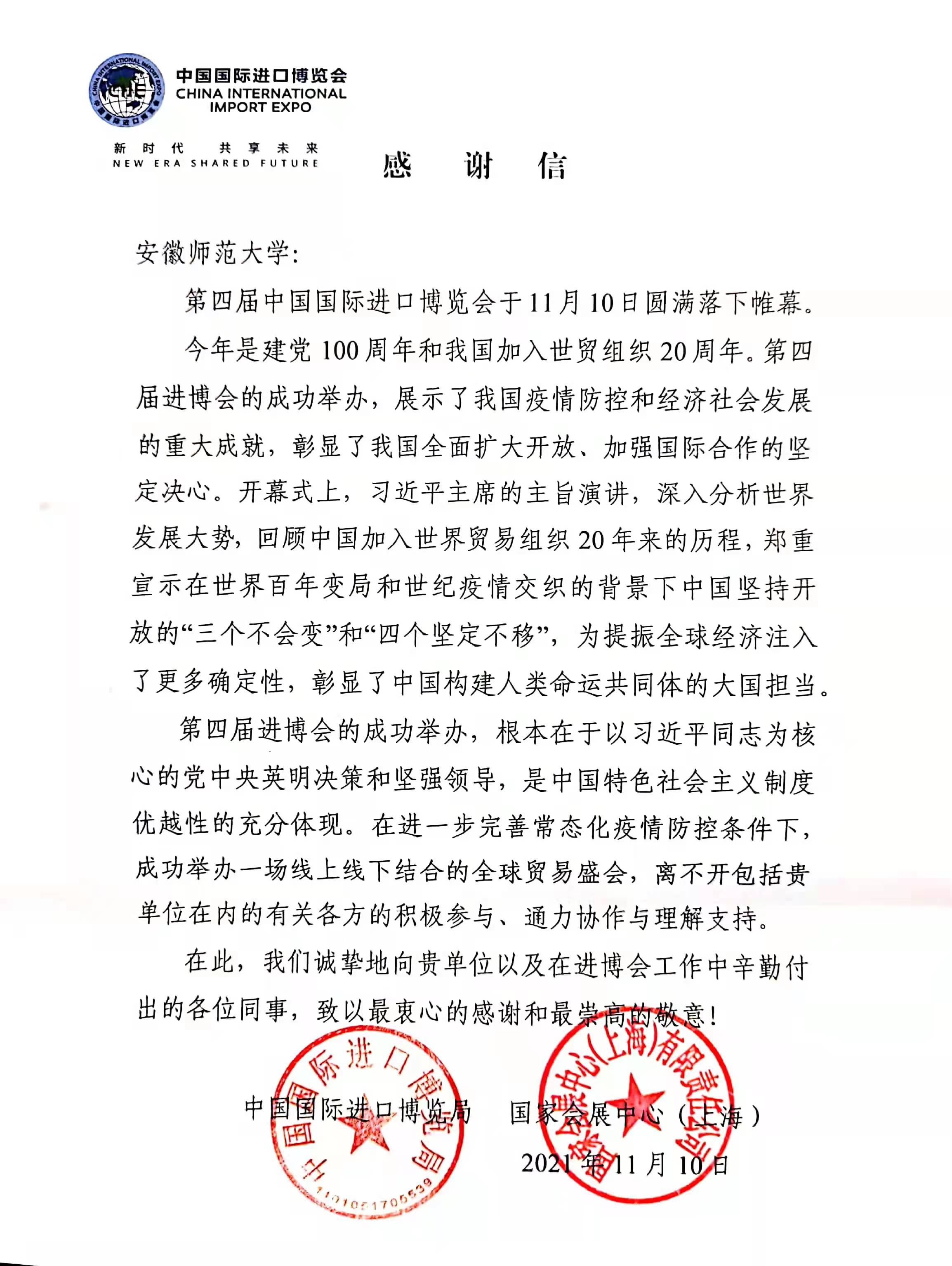 第四届国际进口博览会圆满结束,为了感谢安徽师范大学对第四届国际进口博览会的大力支持以及表扬和鼓励各位同学们在进博会期间的优异表现,中国国际进口博览总局、国家会展中心(上海)向学校发来感谢信,信中写到“在进一步完善常态化疫情防控条件下,成功举办一场线下线上结合的全球贸易盛会,离不开包括贵单位在内的有关各方积极参与、通力协作与理解支持。在此,我们诚挚地向贵单位以及在进博会工作中辛勤付出的各位同事,致以最衷心的感谢和最崇高的敬意!”另外,国家会展中心上海洲际酒店总经理贺纪斯先生为了感谢同学们们在进博会期间所作出的贡献,为同学们颁发了证书和进博会文创产品。