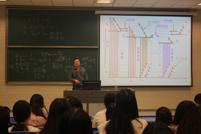 课程伊始,赵广超老师带领同学们简要回顾了上节课的重点内容,为本节课程学习荧光和磷光光谱法做了必要衔接。接着,赵老师用设问的方式,围绕“荧光与磷光光谱的区别”、“荧光波长为何小于磷光波长”、“激发光谱和发射光谱形状为何会呈镜像相似”三个问题,自然引入了本节课的主题——荧光和磷光光谱法原理。这一章节作为仪器分析课程的重难点内容,学生理解较为困难,赵老师用一张张生动简明的图例层层递进,通过介绍原子核外电子的激发和去激过程,深入浅出的介绍了荧光和磷光光谱法的基本原理。最后,他对本节课程内容作了总结,通过他的讲解,完美回答了课程开始提出的三个问题,前后呼应,效果突出。授课过程中,赵广超老师教态自然,教学语言简洁严谨;教学过程深入浅出、层层递进、逻辑清晰;教学内容重难点突出,这些都充分展示了他深厚的教学功底。