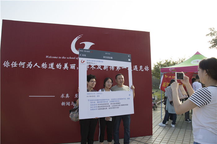 在熙熙攘攘的南体育馆新生报到处,各学院竞相展现各具特色的迎新风貌。文学院一个大大的“文”字体现文院特色,“家长请止步,让孩子迈出第一步”是善意的助学之行;国旅学院摆出的整套茶具充满古色古香的韵味,让新生在闷热的天气中感受到清凉的诗意;法学院的签字板昭示着全体学生一起携手共行;新传学院用一句歌词表现出“第一次遇见的美丽”;环工学院的彩色手印预示着他们将和17级的新生一起前行...