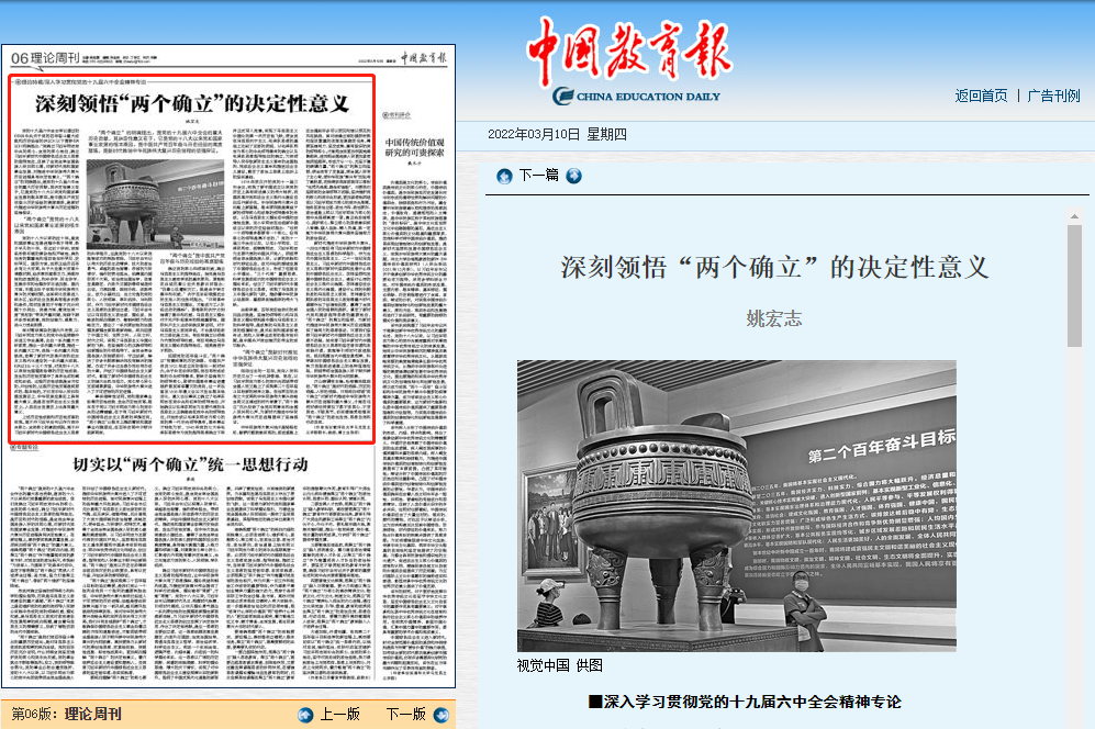 3月10日,《中国教育报》第6版“理论周刊”版面头条以较大篇幅刊发了我校马克思主义学院院长姚宏志教授撰写的深入学习贯彻党的十九届六中全会精神专论文章《深刻领悟“两个确立”的决定性意义》。文章从“‘两个确立’是党的十八大以来党和国家事业发展的根本原因”“‘两个确立’是中国共产党百年奋斗历史经验的高度凝练”“‘两个确立’是新时代推进中华民族伟大复兴历史进程的坚强保证”三个方面深刻阐述了“两个确立”是时代的选择、历史的选择、人民的选择。只有深刻领悟“两个确立”对新时代推进中华民族伟大复兴历史进程的重大意义,才能在任何时候任何情况下都不改其心、不变其志、不毁其节,切实增强贯彻落实“两个确立”的政治自觉、思想自觉和行动自觉。