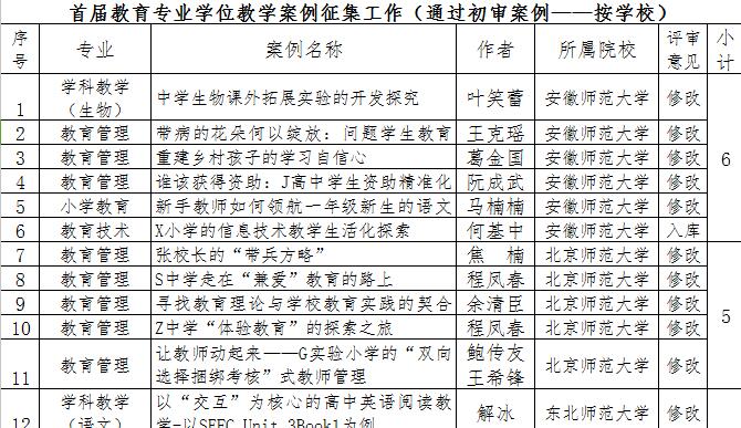 本网讯 近日,全国教育专业学位研究生教育指导委员会公布首届全国教育专业学位教学案例征集工作初审获选名单,我校有6个案例成功入选,在参评的40多所高校中并列第二。入选案例的作者分别是:教育科学学院阮成武教授和刘洋子同学、葛金国副教授和王青峰同学、王清副教授和何基中同学、马家安副教授和王克瑶同学,生命科学学院陈明林教授和叶笑蕾同学,文学院何更生教授和马楠楠同学。其中,王清副教授和何基中同学开发案例直接入选“中国专业学位教学案例中心案例库”;其它案例由教指委教学案例专家工作小组专家提出进一步修改意见和建议,修改通过后正式入库。