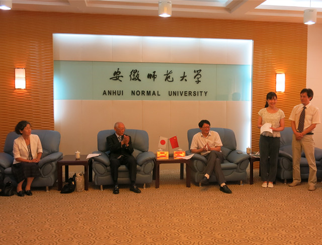 本网讯(国际教育学院 李一鸣)8月8日上午,日本早稻田大学乒乓球队一行十人在前世界冠军、前日本乒协执行主席木村興治先生率领下来我校交流访问。这是继2014年9月以来该代表团对我校的第二次正式访问。校长王伦在赭山校区国教院一楼会客厅迎接来宾并举行了友好会谈。随木村先生来访的有木村先生的夫人木村興治女士、日本乒协中国课长杜功楷先生、翻译王雅洁女士和六位乒乓球队员。外办主任黄圣炯主持欢迎仪式。参加欢迎仪式的有体育学院党委书记袁德水、体育学院副院长高升、外事办副主任杜俊、体育学院特聘教授刁文元、教师朱树笙以及体育学院学生代表们。