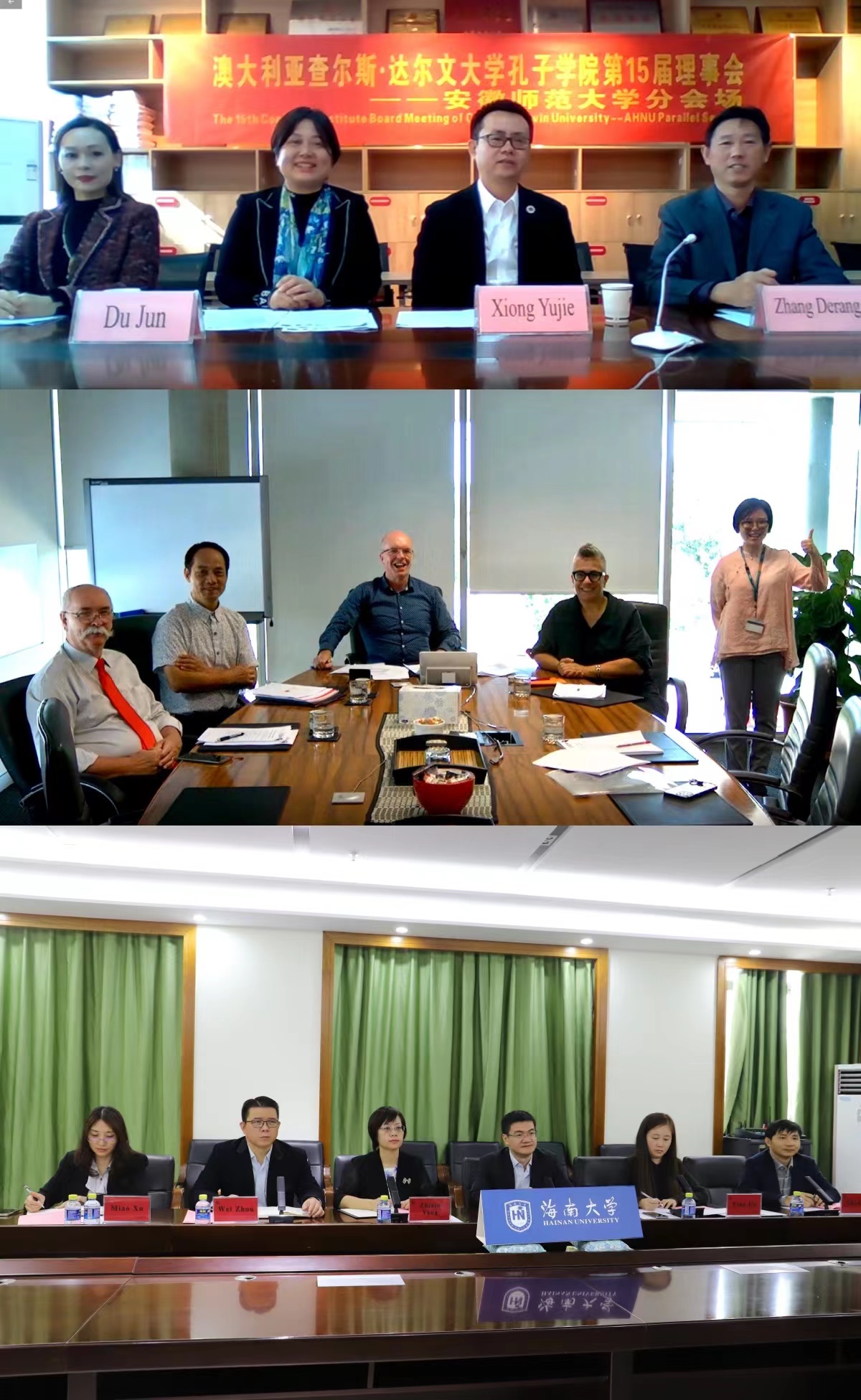 本网讯(国际交流合作处 李一鸣)11月16日,查尔斯·达尔文大学孔子学院第十五届理事会召开。因疫情原因,会议采取会议视频进行,分别在澳大利亚查尔斯·达尔文大学、安徽师范大学和海南大学分会场同时进行。校党委常委、副校长熊宇杰,查尔斯·达尔文大学副校长萨曼·雅各布,海南大学副校长叶光亮出席会议,三校孔子学院理事会成员及学校相关部门负责人参加会议。