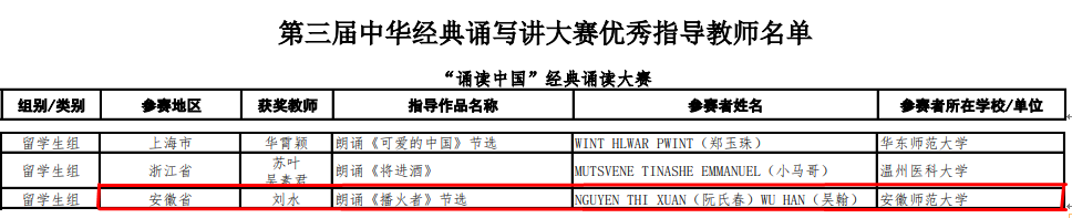 近日,教育部、国家语委公布第三届全国中华经典诵写讲大赛——“诵读中国”经典诵读大赛获奖名单,我校越南籍留学生阮氏春和比利时籍留学生吴翰继在安徽省比赛夺魁之后,一路过关斩将冲进全国总决赛,最终在半决赛朗诵红色经典《播火者(节选)》、总决赛表演《再别康桥》,再次勇拔头筹,夺得留学生组一等奖(全国仅3个),国际教育学院刘水老师获优秀指导教师。