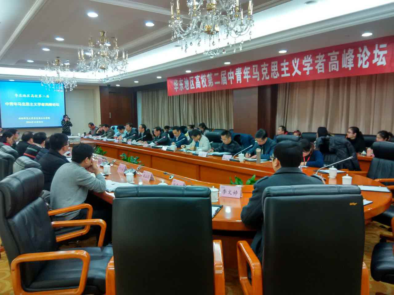 本网讯 11月25-27日,由《马克思主义理论学科研究》杂志社、《学校党建与思想教育》杂志社和安徽师范大学马克思主义学院联合举办的华东地区高校第二届中青年马克思主义学者高峰论坛于在我校隆重召开。本次论坛以“人类命运共同体与中国道路”为主题,来自复旦大学、中国人民大学、华东师范大学、华东政法大学、上海交通大学、上海大学、华东理工大学、上海理工大学、河海大学、苏州大学、江苏大学、扬州大学、温州大学、山东财经大学、安徽师范大学等20余所高校以及《马克思主义理论学科研究》、《学校党建与思想教育》、《学术界》等知名期刊的中青年专家学者40余人参加了此次论坛。论坛开幕式由科研处副处长戴兆国教授主持。