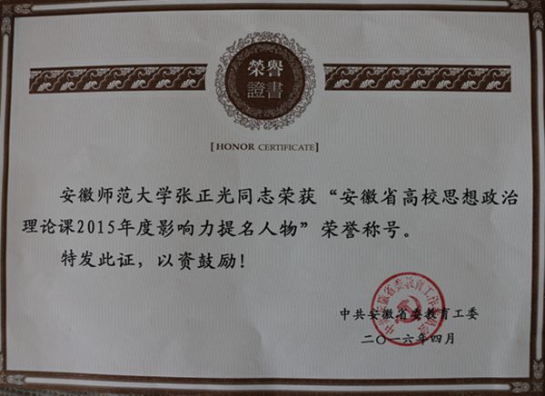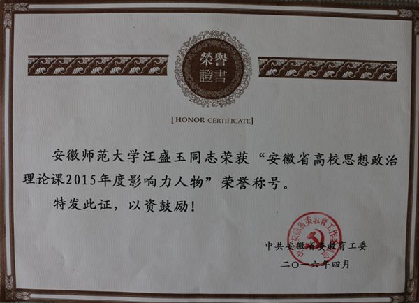 本网讯 近日,中共安徽省委教育工委正式公布了2015年度影响力人物和年度影响力提名人物的评选结果,我校马克思主义学院汪盛玉教授获“安徽省高校思想政治理论课教师2015年度影响力人物”荣誉称号,张正光教授获“安徽省高校思想政治理论课教师2015年度影响力提名人物”荣誉称号。