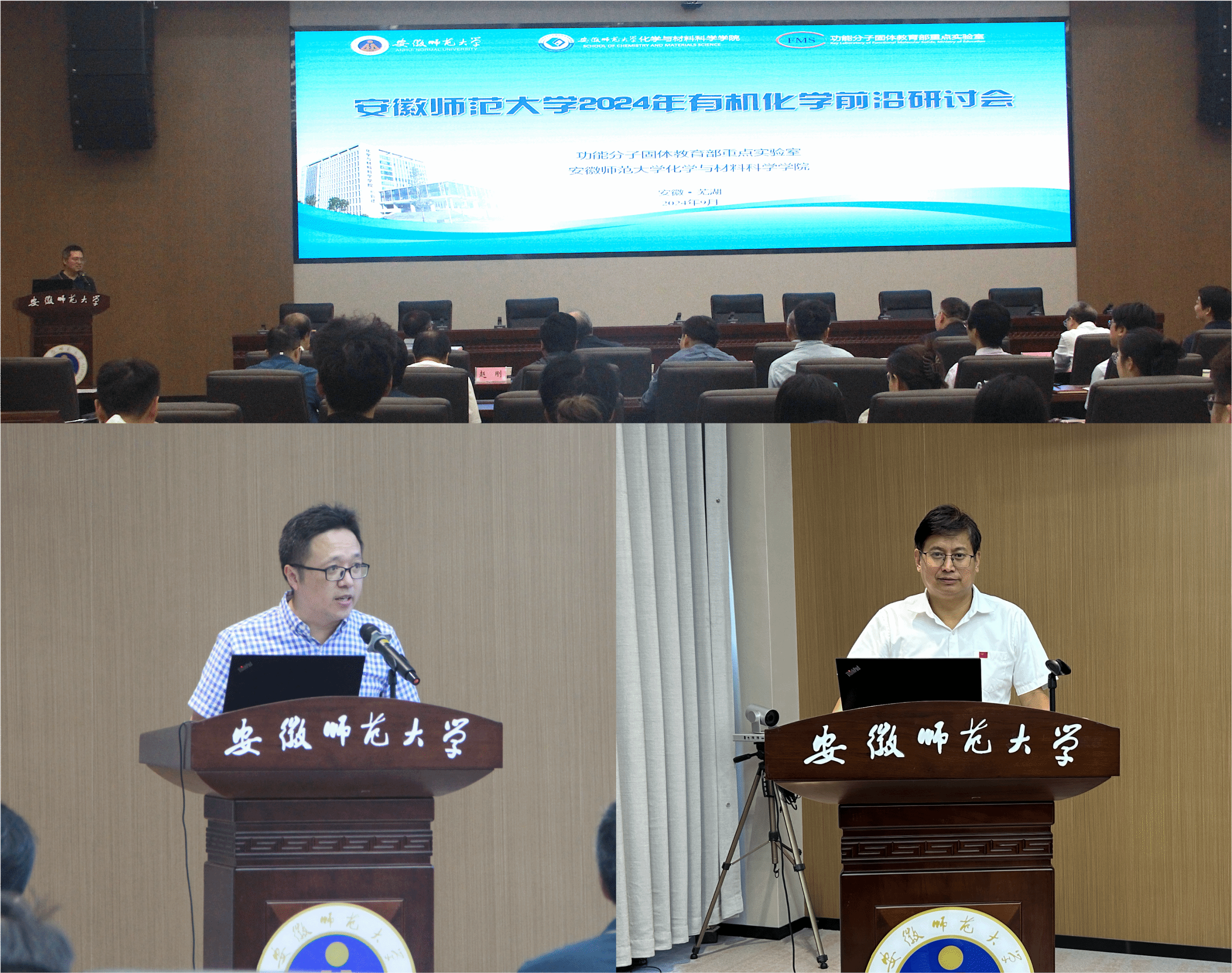 2024年9月23-25日,由安徽师范大学“功能分子固体”教育部重点实验室、化学与材料科学学院主办的安徽师范大学2024年有机化学前沿研讨会在花津校区文典楼东侧E区3楼视频会议室举行。中国科学技术大学郭庆祥教授,安徽工程大学王绍武教授,国家杰青、中国科学院上海有机化学研究所赵刚研究员,国家杰青、中国科学院化学研究所陈传峰研究员,国家级人才、安徽大学朱满洲教授,河南大学王华教授,合肥工业大学许华建教授,安徽大学于海珠教授,我校化学与材料科学学院院长庄桂林教授、“功能分子固体”教育部重点实验室主任商永嘉教授、化学与材料科学学院副院长周双六教授、重点实验室相关科研人员及学生共百余人参加了此次论坛。化学与材料科学学院王官武教授主持开幕式。
