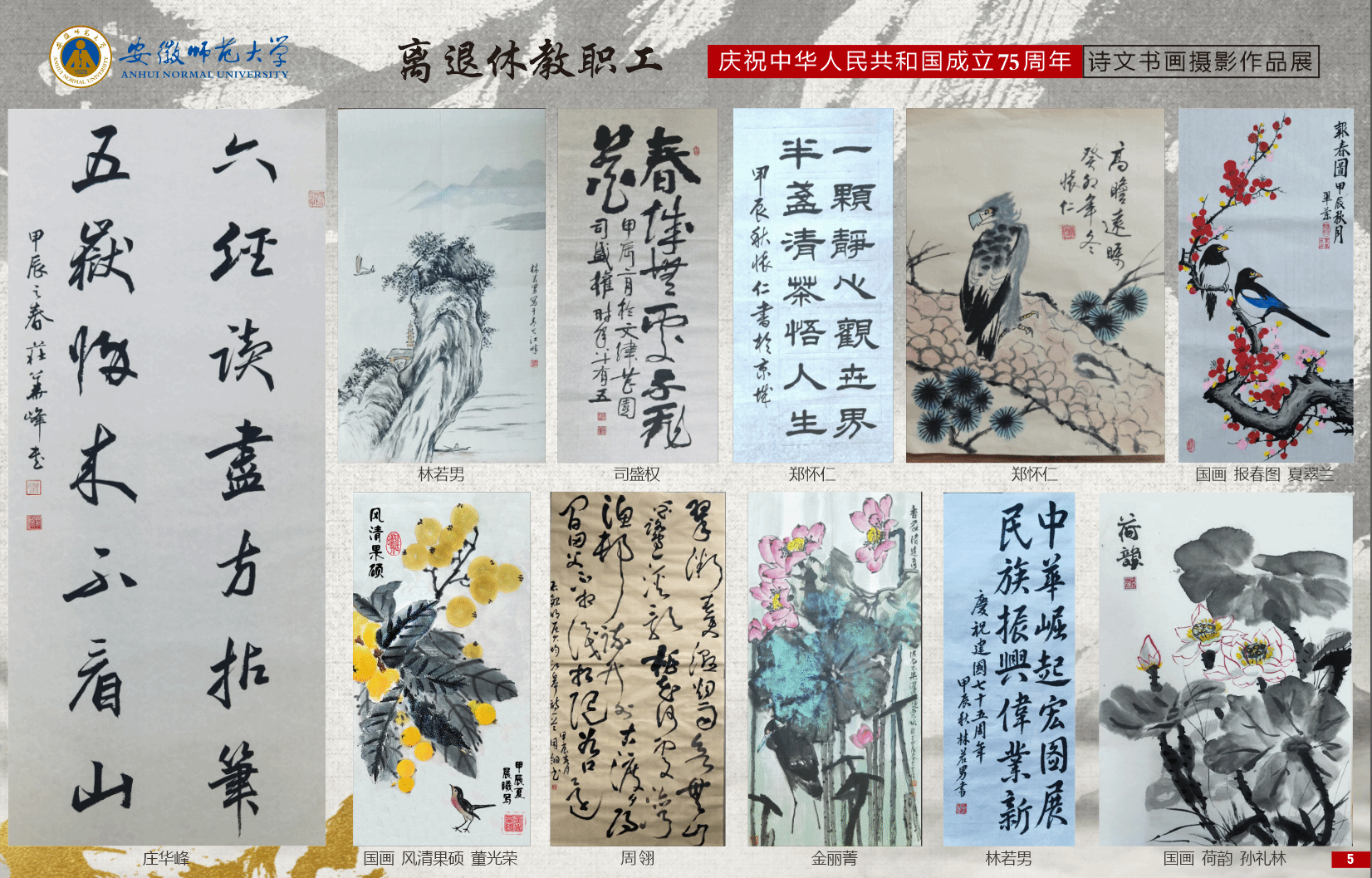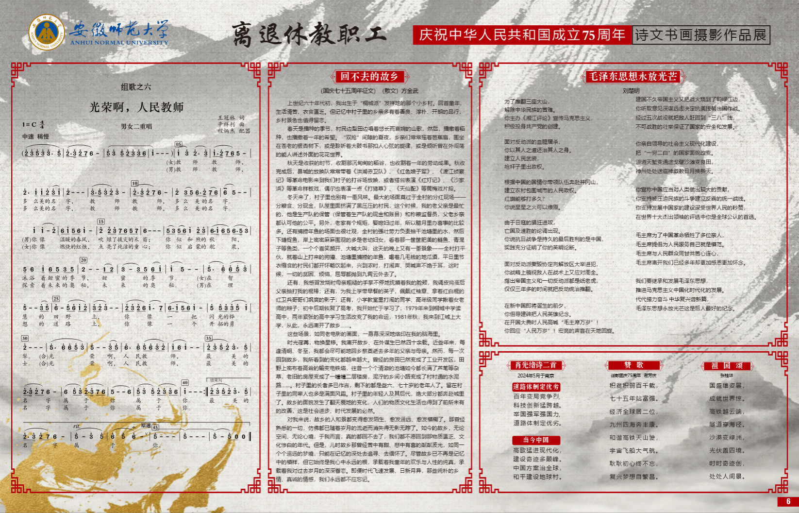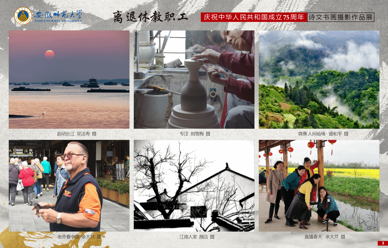 与时代同行——安徽师范大学离退休教职工诗文书画摄影作品展,不仅见证了老年朋友们对艺术的执着追求,更感受到了他们对祖国深沉的爱。他们的每一副作品都是他们用心灵和智慧绘制的时代画卷,每一张照片都是他们用情感和视角捕捉的历史瞬间,每一首赞歌都如同一颗颗璀璨的星辰,汇聚成一片璀璨的星河,照亮了共同的时代记忆。