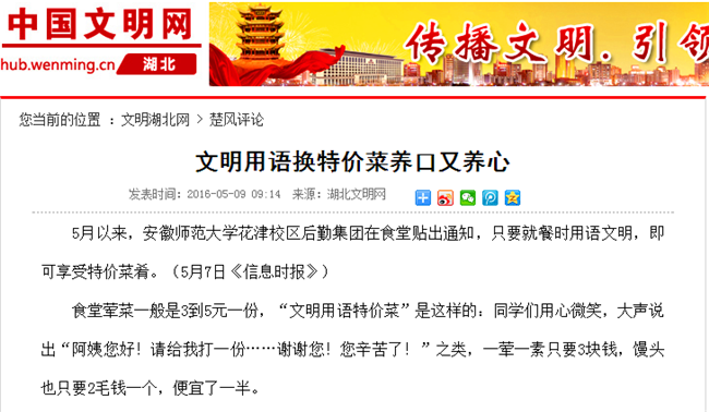 荆楚网发表评论员文章《打饭打对折也是一种精神“扶贫”》,作者李忠卿认为:“安徽师范大学为倡导文明新风,将使用文明用语与学生就餐巧妙结合,我以为很新鲜、很接地气。”“给学生就餐打对折,或许解决不了某些学生的物质匮乏,但从某种意义上来说也是一种精神“扶贫”,因此弥足珍贵,值得尝试。”