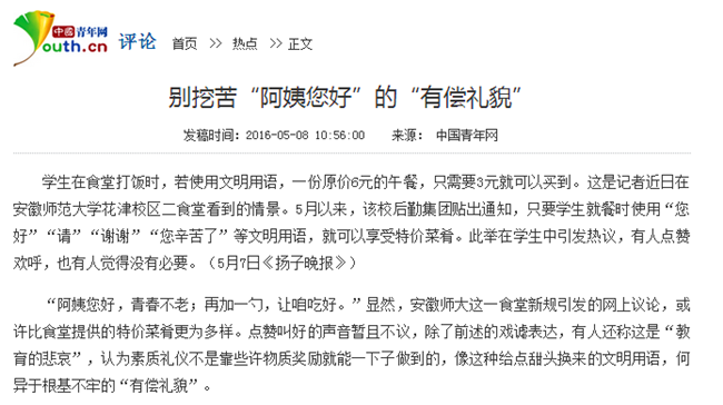 面对少数网友的质疑,中国青年网发表评论员署名文章《别挖苦“阿姨您好”的“有偿礼貌”》,明确指出:“学校食堂的‘礼貌值钱’,只是一种循序渐进、潜移默化的激励手段,其目的还在于,学生因此受到的启迪不仅停留在食堂窗口,而是能慢慢习惯成自然地带到任何场合。由此说来,‘阿姨您好’的创意优惠有啥不好呢?”