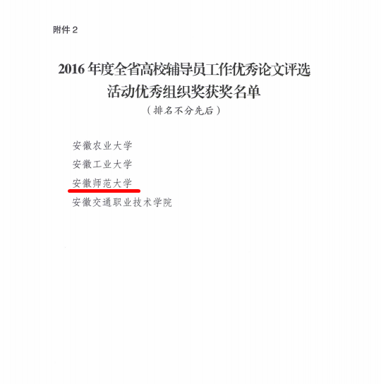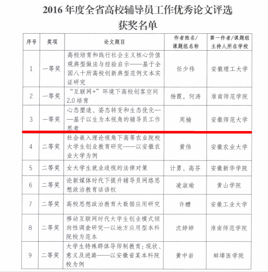本网讯(学生处 汪婕) 近日,由安徽省教育厅主办的2016年度安徽省高校辅导员优秀论文评选结果公布。我校马克思主义学院辅导员周楠等三位老师的论文分获一等奖、三等奖和优秀奖,学校荣获优秀组织奖。