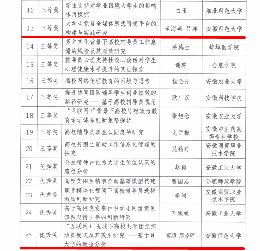 我校马克思主义学院辅导员周楠撰写的《心态塑造、姿态转变和生态优化——基于以生为本视角的辅导员工作思考》荣获一等奖;经济管理学院党委副书记李海燕等撰写的《大学生党员全媒体思想引领平台的构建与实践研究》荣获三等奖;历史与社会学院辅导员宫超等撰写的《“互联网+”视域下高校共青团组织动员模式及其效用研究——基于W大学的数据分析》荣获优秀奖。三篇论文是学校从各学院报送的34篇论文中遴选出来的,并专门组织专家进行了查重、评审和指导修改。