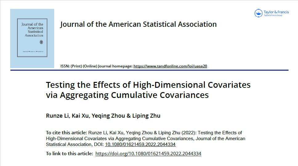 近日,数统学院青年教师许凯博士以共同第一作者身份与美国宾州州立大学李润泽教授、同济大学周叶青博士、中国人民大学朱利平教授合作的研究论文“Testing the Effects of High-Dimensional Covariates via Aggregating Cumulative Covariances”被统计学“四大”期刊《Journal of the American Statistical Association》(美国统计学会会刊,简称JASA)在线发表。JASA是美国统计协会旗下出版的专业性统计期刊,是目前国际统计学界论文质量最高、覆盖领域最广的顶级学术期刊之一,2021年影响因子为5.033,先后发表过统计学领域内多项重要的创新性成果。