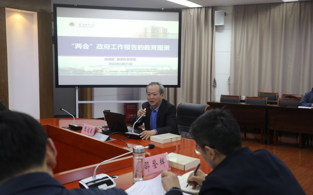 教育科学学院教授、博士生导师阮成武围绕“两会”政府工作报告的教育图景作专题辅导报告,从十年来政府工作报告的教育图景及其实现、面向“十四五”及2035远景目标的教育图景和今年政府工作报告的教育图景三个方面进行详细解读,并提出学校学科评估升级进位的发展目标及建议。陆林、熊宇杰围绕学习领会全国两会精神,结合学习体悟和工作实际分别进行了专题研讨发言。