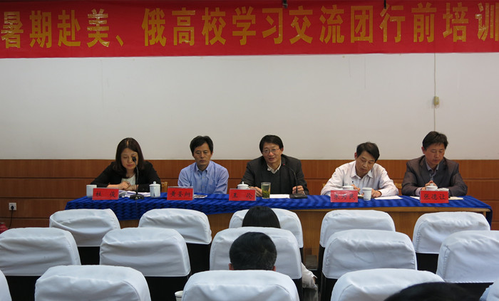 本网讯(国际教育学院 李一鸣)4月23日下午,我校教师第七期赴美培训团和第三期赴俄培训团的行前培训开班典礼在国际教育学院报告厅举行。校长王伦出席典礼并发表讲话。人事处处长朱为民、外事办主任黄圣炯及访美、访俄代表团成员共同参加了开班典礼。典礼由外事办副主任杜俊主持。