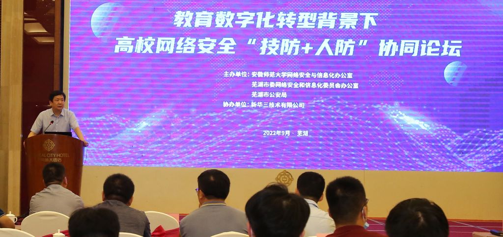 为协调做好“技防+人防”的高校网络安全工作,从攻击角度思考如何防守、从防守角度如何统筹完善技术防护体系和管理体系、从第三方服务角度谈如何做好高校安全服务与支撑,学校网络安全与信息化办公室与芜湖市网络安全和信息化委员会办公室、芜湖市公安局于2022年9月18日下午在中央城大酒店共同主办了教育数字化转型背景下:高校网络安全“技防+人防”协同论坛,在芜高校、芜湖市公安局网安支队、市委网信办等相关单位参加了此次论坛。本次论坛得到了新华三技术有限公司的大力协助和支持,论坛活动由网信办副主任吴长义、聂竹明共同主持。