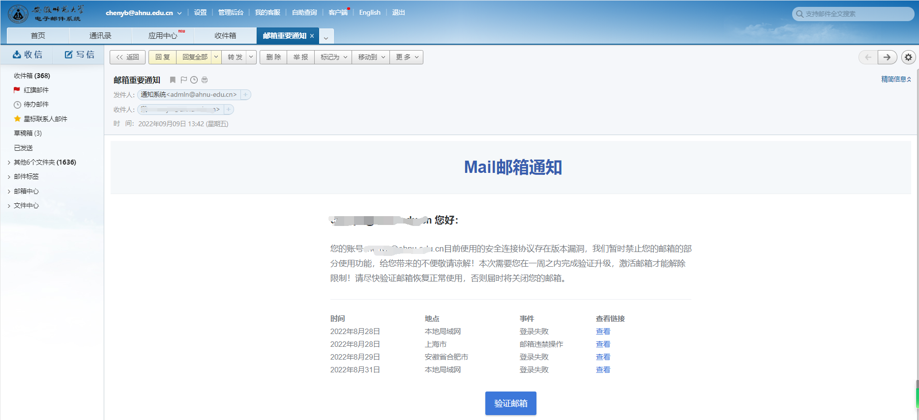 国内高校邮箱用户非常活跃,境外不法分子常暗中窥探,邮件安全亟待重视,为提高师生对钓鱼邮件的甄别能力,切实体会钓鱼邮件的迷惑性和隐蔽性,网络安全与信息化办公室选取了邮箱活跃用户作为演练对象,精心设计了疫情防控、校园招聘、系统升级等常见的钓鱼邮件主题为演练内容,于2022年9月9日对选定的邮箱发送钓鱼邮件。