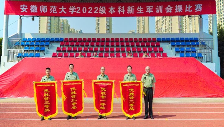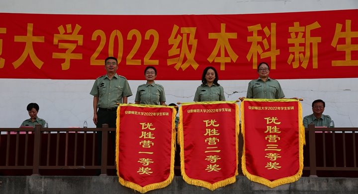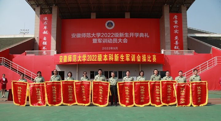 综合日常和会操比赛考核,学校对2022级本科新生军训中涌现的先进个人和先进集体予以表彰,历史学院、新闻与传播学院、物理与电子信息学院、化学与材料学院、生命科学学院、特战营获得军训优胜营“一等奖”,其他各营分获优胜营二、三等奖;授予一团二营一连(化学与材料学院)等10个连队为军训“优胜连队”称号,操晶晶等15名辅导员军训“优秀指导员”称号,陈金海等20名教官“优秀教官”称号,何枫等24名助训教官“优秀助训教官”称号,王敏等395名本科新生军训“优秀学员”称号。参加会操比赛的校领导、部队首长及军训工作领导组成员为获表彰的先进集体和个人颁发了锦旗和证书。