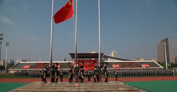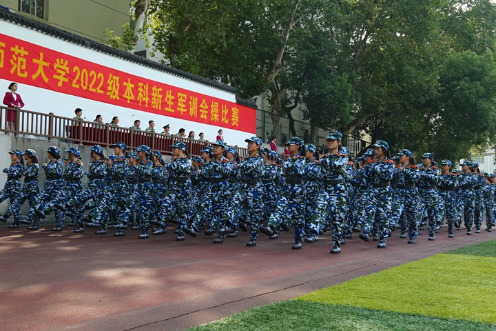 三个校区的会操比赛伴随着冉冉升起的国旗拉开了帷幕。2022级本科新生军训旅的65个连队方阵在各校区踏着慷慨激昂的解放军进行曲作分列式汇报,比赛现场气氛热烈高涨,全体参训新生们以整齐的队伍,威武的军姿,昂扬的斗志,响亮的口号,接受学校领导老师和部队首长的检阅,充分展示了学校军事训练和国防育人成果。三个校区分列式比赛前后,旅直属特战营各连队进行了军事技能展示,现场不断响起热烈的掌声与欢呼声,女子防身术连的飒爽英姿、铁拳连的铮铮铁骨、射击连队的默契配合、尖刀连队的铁血传承,全体特战营新生们以饱满的精神状态展现了师大新青年的刚毅与勇敢,青春与担当,获得了全场师生的一致好评。