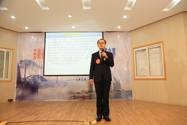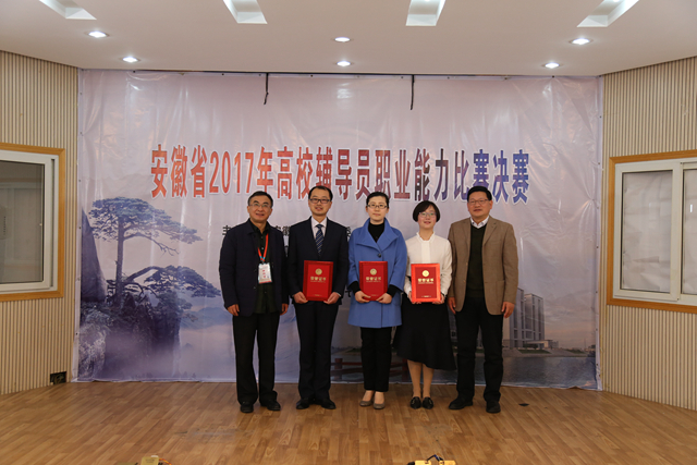 本网讯(文 /汪婕 图/学工助理)3月24日至26日,安徽省2017年高校辅导员职业能力比赛决赛在安徽师范大学大学生活动中心举行。我校历史与社会学院辅导员宫超、法学院辅导员瞿津津双双荣获特等奖。 两天的赛程里,来自全省三个片区的30名选手以大赛为平台、交流经验、展示风采、相互促进、共同提高。比赛项目既有对辅导员相关知识的掌握程度以及对信息的理解分析和问题破解能力的考察,也有对辅导员语言表达能力、沟通技巧以及运用相关学科知识和方法开展大学生思想政治教育、分析判断解决问题的技巧与能力的测试。宫超和左瞿津津两位辅导员在比赛中凭借扎实的工作基础、缜密的逻辑思维、流畅的语言表达和良好的精神风貌,充分展示了我校辅导员过硬的综合素质与能力水平,分别以第一名和第三名的总成绩荣获特等奖。