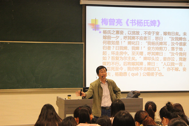 本节课主要涉及“小说笔法”的“横断面写法”,包括“旁观者角度”和“细节描写”两个方面。吴老师首先回顾了“古文”“小说”等概念,结合史传文学传统,归纳出“古文”中所蕴含的“小说笔法”,进而深入剖析“小说笔法”的具体内涵。随后他以戴名世《徐某》、梅曾亮《书杨氏婢》为例,分别展现“旁观者角度”和“细节描写”这两个重要技法。最后通过评析学生习作,让学生深入理解“小说笔法”体现的艺术魅力,并列举了大量相关论著及参考论文,为同学们进一步了解“小说笔法”的研究情况指明了方向。教学过程中,吴老师思路清晰,以论文写作方法组织课堂,将古代文学研究与师范生作文训练结合起来,授课内容精深前沿,极具启发性,且在揄扬桐城文章高妙的“小说技法”时,又能深入一步,揭示相关文章所要彰扬的“义理”中的陈腐因素,真正实现了“以生为本”“教书育人”的教学理念。