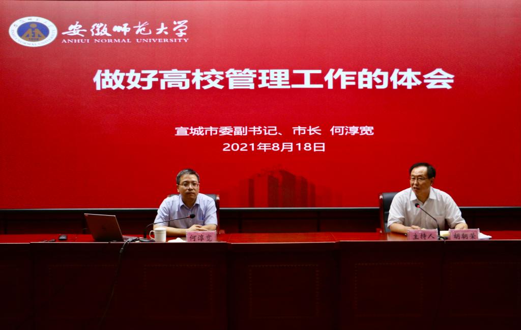本网讯(新提任中层干部专训班 班委会)8月18日,宣城市委副书记、市长何淳宽以“做好高校管理工作的体会”为主题,给新提任中层干部培训班作专题报告。校党委书记胡朝荣主持报告会,校党委副书记蒋家平和全体学员共同聆听了报告。