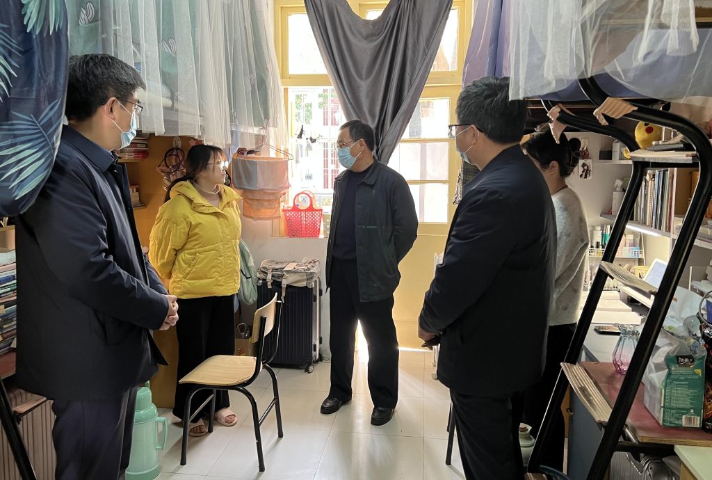 在学生宿舍,胡朝荣走进寝室,与同学们亲切交流,耐心询问生活及学习情况。胡朝荣说,近期,为了保障校园安全和同学们身体健康,学校按照省市疫情防控管理规定,从严从紧强化校园安全管理,希望同学们能够理解,增强自我管理意识和能力,积极面对学习生活。同时,胡朝荣嘱咐大家在学习之余要注意身体健康,走出宿舍,多去校园走走,欣赏校园春景,陶冶身心。大家纷纷感谢学校领导的关心、关怀,表示将以积极乐观向上的态度和精神投入到这段特殊时期的学习生活中,珍惜时光,努力学习。