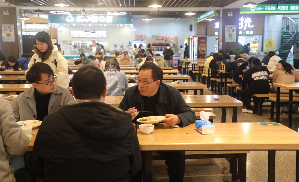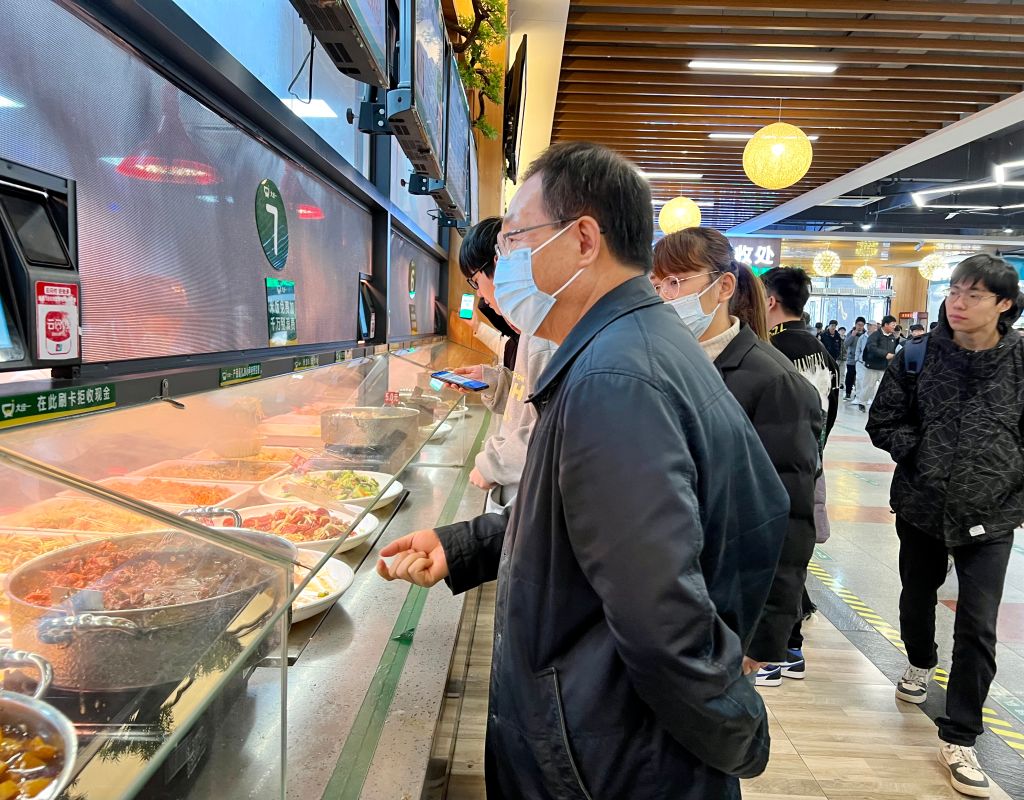 中午12点,胡朝荣来到学生食堂,仔细查看食堂各窗口菜品种类和价格,叮嘱相关负责人员,一定要保证食品安全及供给量,稳定饭菜价格,满足疫情防控期间在校师生的餐饮需求,同时要及时配给超市食品和生活用品,让同学们在学校安心、让家长放心。随后,胡朝荣来到窗口排队打饭,与同学们一起共进午餐、面对面交流。就餐过程中,胡朝荣不时关切询问同学们近期学习生活状况和需求,“饭菜合不合口味?价格贵不贵?”“最近在上哪几门课?学院领导都认识吗?对学校还有什么建议?”同学们各抒己见、畅所欲言,气氛温馨而愉快。