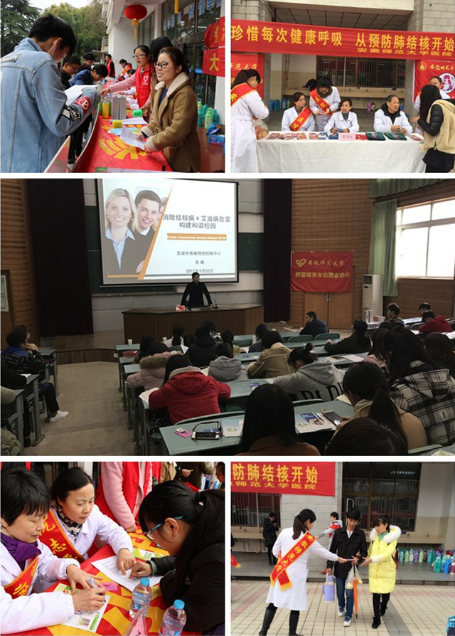 据悉,我校历来重视结核病防控工作,校医院每年都会通过新生入学体检、毕业生体检、在学校主页和校医院网页发布疾病防治知识等多种形式开展结核病知识宣讲,定期举办专题讲座及主题宣传活动,指导经管学院新锋志愿者协会、物电学院爱心卫生志愿服务团队等志愿服务组织获得“安徽省百千万志愿者结核病防治知识传播行动大学生志愿者团体培育计划”立项资助,2016年两个团队均获安徽省百千万志愿者结核病防治知识传播行动优秀志愿者团体。今后,校医院将继续创新宣传形式、丰富宣传内容,发挥结防志愿者的宣传作用 ,形成结防知识传播链,将结核病防治知识传播到每个学生,共同营造结核病防治工作的良好氛围,为有效控制结核病疫情、建设和谐平安校园作出贡献。(校医院供稿)