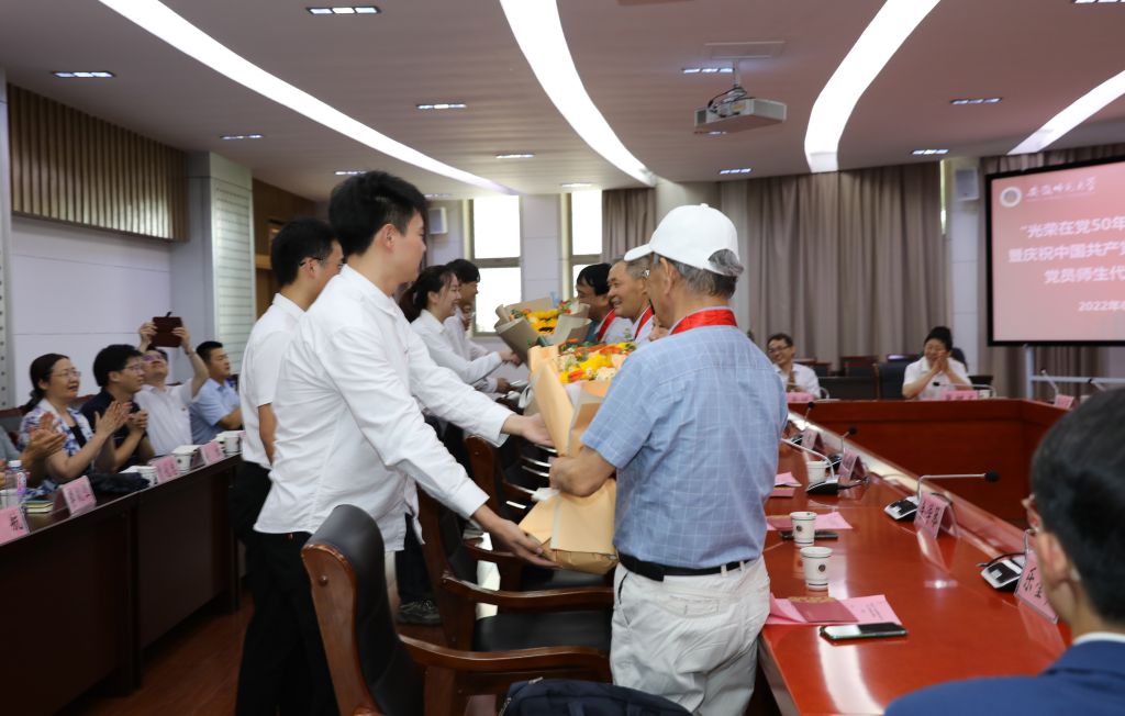 会上,周新发宣读“光荣在党50年”致敬词,向获得纪念章的老党员表示热烈的祝贺和崇高的敬意。胡朝荣为“光荣在党50周年”的老党员代表一一颁发了纪念章,学生新党员代表为老党员献上了鲜花。