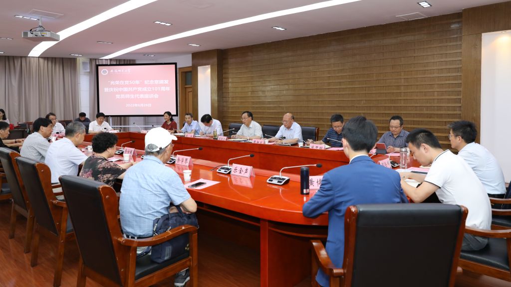 6月28日,在中国共产党成立101周年之际,学校举行“光荣在党50年”纪念章颁发暨庆祝中国共产党成立101周年党员师生代表座谈会,深入学习和重温习近平总书记在庆祝中国共产党成立100周年大会上的重要讲话精神,弘扬伟大建党精神,致敬“光荣在党50年”老党员,激励全校党员师生忠诚尽职、奋勇争先,以更加昂扬的斗志投入高水平大学建设新征程。校党委书记胡朝荣主持会议并讲话。校党委常委、纪委书记、监察专员周新发,学校“光荣在党50年”的老党员代表,相关职能部门、院级党组织负责人,师生党员代表参加会议。