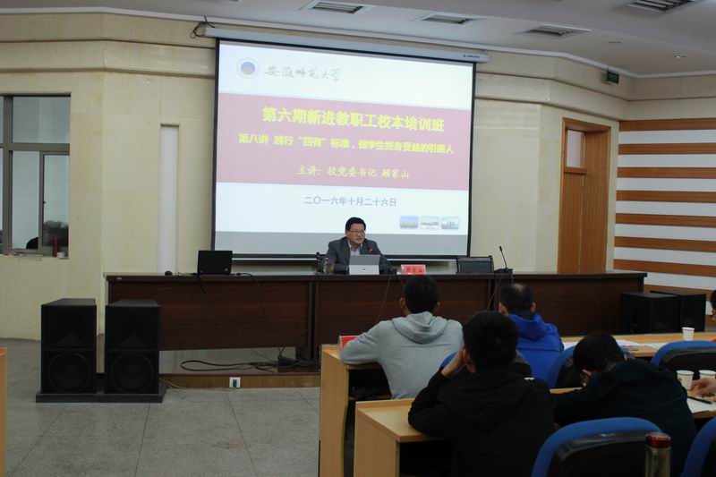 本网讯(人事处 谢康)10月26日下午,校党委书记顾家山为2016年新进教职工校本培训班学员做了题为《践行“四有”标准,做学生终身受益的引路人》的报告,培训班全体学员和人事处有关人员认真聆听了报告。报告由人事处处长朱为民主持。