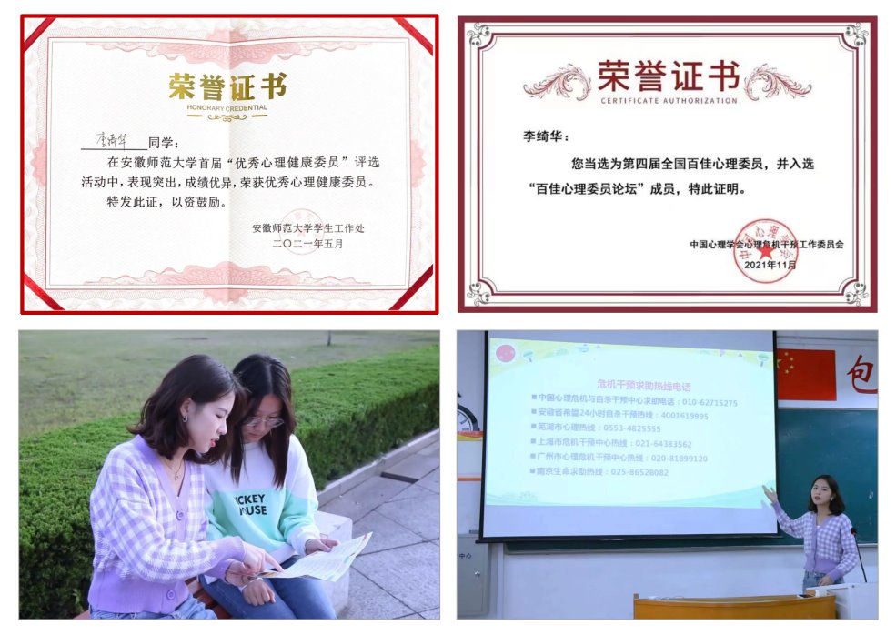 四年以来,关爱集体,乐于助人,有效构建学院学生的良好心理健康防护网。作为学院发展辅导站学生负责人和班级心理委员,李绮华同学在日常生活中主动关心支持身边同学,积极搜寻校内外可利用的心理援助资源进行“线上+线下”的介绍与传播,曾参与开展学院心理服务活动20余次,组织学生进行心理排查30余次;在“倾听、真诚、给予爱和接受爱”这一助人宗旨的指引下,曾帮助20余名同学解决心理问题,是同学信赖的“心上人”、 班级可靠的“排雷兵”和师生点赞的“服务员”。