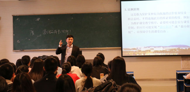 李宜江老师围绕“课堂教学中法律价值的冲突与协调”、“教师法律素养的养成”等方面阐述学生教育与管理中的教师法律智慧,以对法律的三大价值——自由、正义和秩序的介绍引入课堂内容,讲述了课堂教学中的法律价值间的冲突及其协调原则,最终将内容落在“树立依法治教的信念,做一个有理性的教师”这一关键点上,对师范生的教育法律法规素养的形成起到潜移默化的影响。同时李老师充分利用教育法律法规的专业知识及中小学课堂生动的案例进行教学,在围绕案例分析的师生互动中,既加深了学生对教学内容的理解,又提高了学生对课堂实践中的教育法律法规知识的学习兴趣和运用教育法律法规知识分析教育实际问题的能力。李老师教态自然大方,语言风趣幽默,讲解案例丰富,分析详实透彻,条理清晰明白,充分展示其独特的教学魅力。