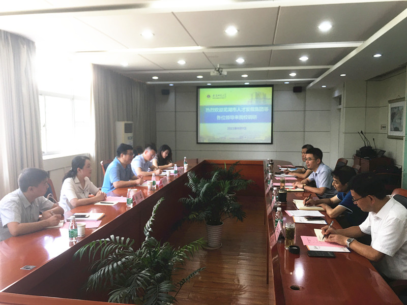 本网讯(人事处)8月9日上午,芜湖市人才发展集团董事长杨少华、总经理许兰一行来校调研交流,校党委常委、副校长任永热情接待了杨少华一行。调研座谈会在花津校区行政楼第一会议室举行。会议由人事处处长朱为民主持。