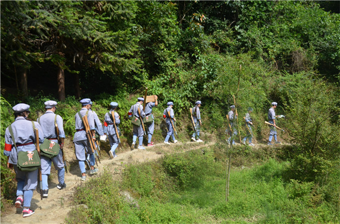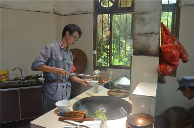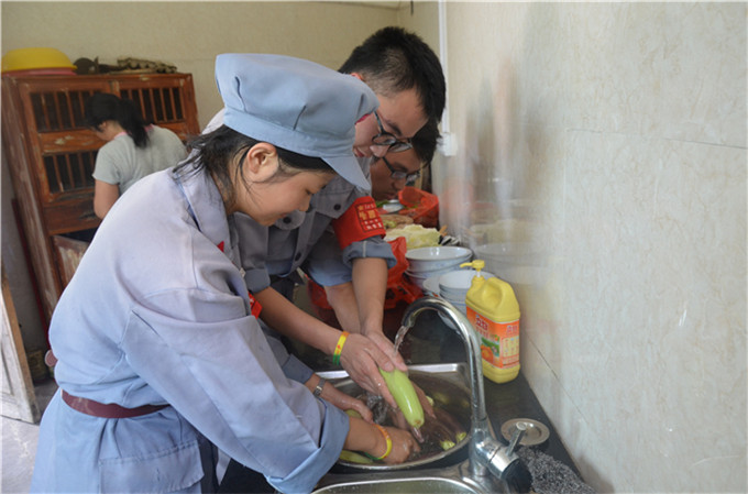 当年的红军以自强不息的精神在敌人的封锁线中顽强生存,亲自体验红军餐的制作,成为整个红军体验生活的一种特色。来到老乡家中,“炊事员”吴辉亲自下厨,与助手们在厨房中忙的不亦乐乎,由于使用的是传统的灶台进行烹饪,有负责添柴烧火,有洗菜切菜,还有掌勺做菜的,不一会的功夫便完成了一大桌的美味佳肴。
