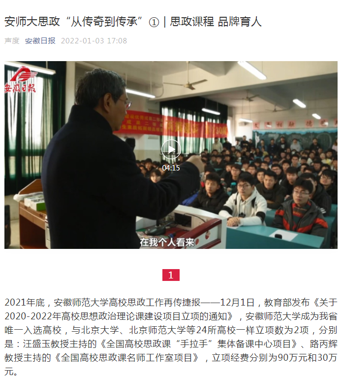 2021年底,安徽师范大学高校思政工作再传捷报——12月1日,教育部发布《关于2020-2022年高校思想政治理论课建设项目立项的通知》,安徽师范大学成为我省唯一入选高校,与北京大学、北京师范大学等24所高校一样立项数为2项,分别是:汪盛玉教授主持的《全国高校思政课“手拉手”集体备课中心项目》、路丙辉教授主持的《全国高校思政课名师工作室项目》,立项经费分别为90万元和30万元。