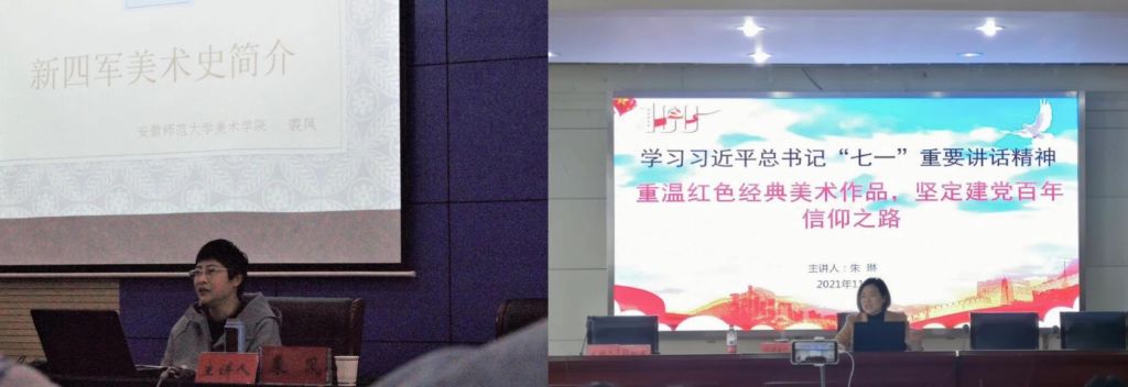 学习百年党史,汲取奋进力量,学院开展了多场党史专题讲座。邀请裘凤副教授专题讲授《新四军美术史》,讲座以专业为契合点讲授了新四军美术史,将学党史与专业知识相结合,既学习了中国共产党艰苦奋斗的历史,又拓展了专业知识面。美术学院党委副书记朱琳创新党课形式,专题讲授《学习“七一”重要讲话精神——以红色经典美术作品助力党史学习教育》,以四个重要历史时期的红色经典美术作品为切入点,深刻阐述了中国共产党为什么能、马克思主义为什么行、中国特色社会主义为什么好等问题。