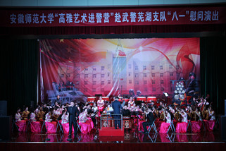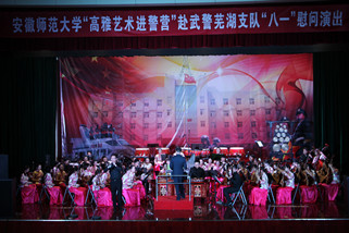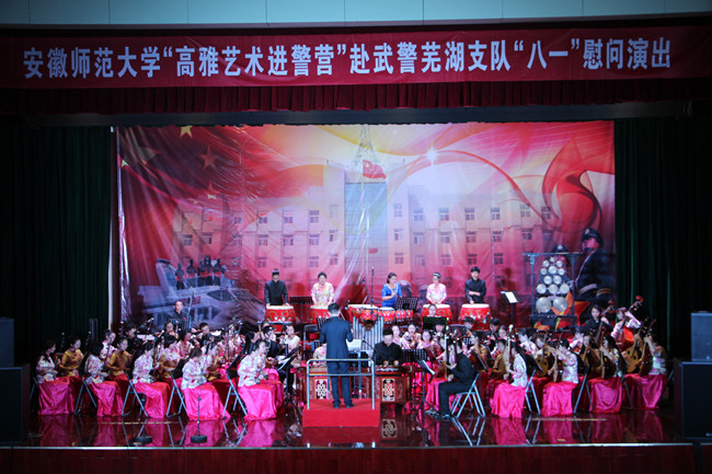 慰问演出由安徽师范大学民族管弦乐团承担,音乐学院近80名师生将音乐化作浓浓的深情,向人民子弟兵们致敬,献上深深的祝福,音乐会在民乐合奏《欢腾的节日》那欢快的乐曲声中拉开的帷幕。二胡独奏《一枝花》高亢嘹亮,悲壮激越;原创民族管弦乐合奏《忠魂》,唤起人们对峥嵘岁月的深情回忆,激发后辈对革命先烈的真挚缅怀;《再见了,大别山》唱出了共产党人为人民奉献牺牲的使命担当;《把一切献给党》、《跟你走》、《江山》等脍炙人口的歌曲歌颂着武警战士忠诚于家国人民,勇于奉献的担当精神;《军营里飞来一支百灵》则用歌声诉说着对武警官兵日夜守护江城安宁的感谢;器乐独奏《百鸟朝凤》、《牧民新歌》、民族管弦乐《龙腾虎跃》更是以热情欢快的旋律描绘着盛世美景,渲染了警民携手取得抗洪阶段性胜利的群众欢腾场面。音乐会在《花好月圆》的音乐声中落下帷幕,军营里处处洋溢着一派节日的喜庆气氛。
