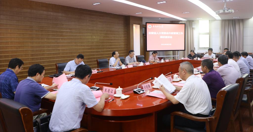 本网讯(国际交流合作处)9月22日,安徽省人大常委会委员、外事工委主任黄晓求,副主任杜玉山一行来校调研外籍教师管理工作。芜湖市人大常委会一级巡视员凤剑峰,市人大常委会委员、监察和司法(民宗侨外)工委副主任孙玉富一行陪同调研。校党委书记胡朝荣,党委常委、副校长熊宇杰,党委常委、办公室主任曾黎明,以及学校人事处、国际交流合作处、历史学院、外国语学院、生命科学学院等部门和学院主要负责人参加了座谈会。会议由胡朝荣主持。