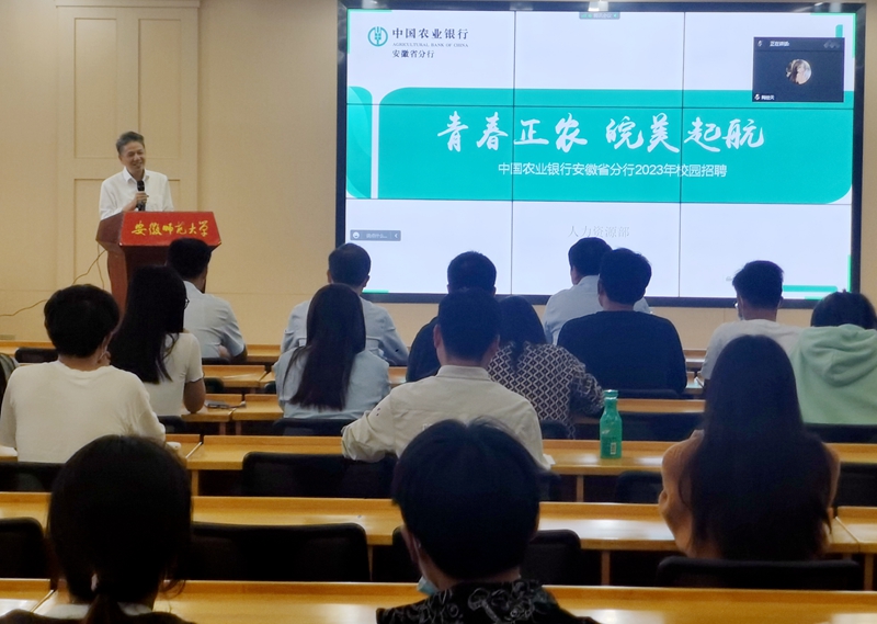 9月28日下午,中国农业银行安徽省分行来校组织2023届毕业生校园招聘宣讲会,校党委常委、副校长陆林莅临指导讲话,开启我校秋季校园招聘活动。在做好疫情防控保障下,宣讲会采取线上线下同步直播方式进行,170余名毕业生参加求职应聘。